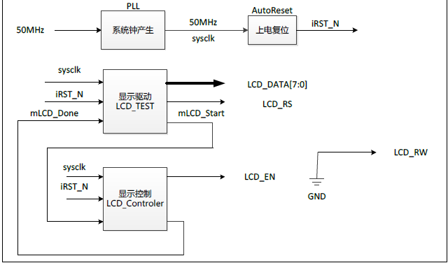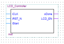 本模块接收系统时钟与上电复位模块输出以及mLCD_start作为输入,输出为LCD_EN与mLCD_done信号,如图7: