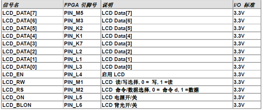 分析图1、表1,我们能得到FPGA与LCD模块之间是8根数据线、5根控制线,为了简化我们程序内部的逻辑,经过分析,在本次实验中,我们只对LCD进行写操作,而误差控制我们通过增大每次写数据后的延时来减小,所以LCD_RW可以始终置0;LCD_ON始终置1;LCD_BLON可始终置1或0。