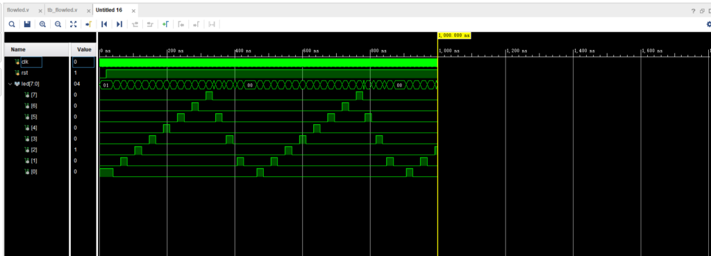 如图所示,在每两个时间间隔,led[7:0]由[0]到[7]依次发光并在一个时间间隔后熄灭。之后,每隔1.5个时间间隔,由[7]到[1]间隔闪烁,且亮一个时间间隔灭0.5个时间间隔,符合实验要求。