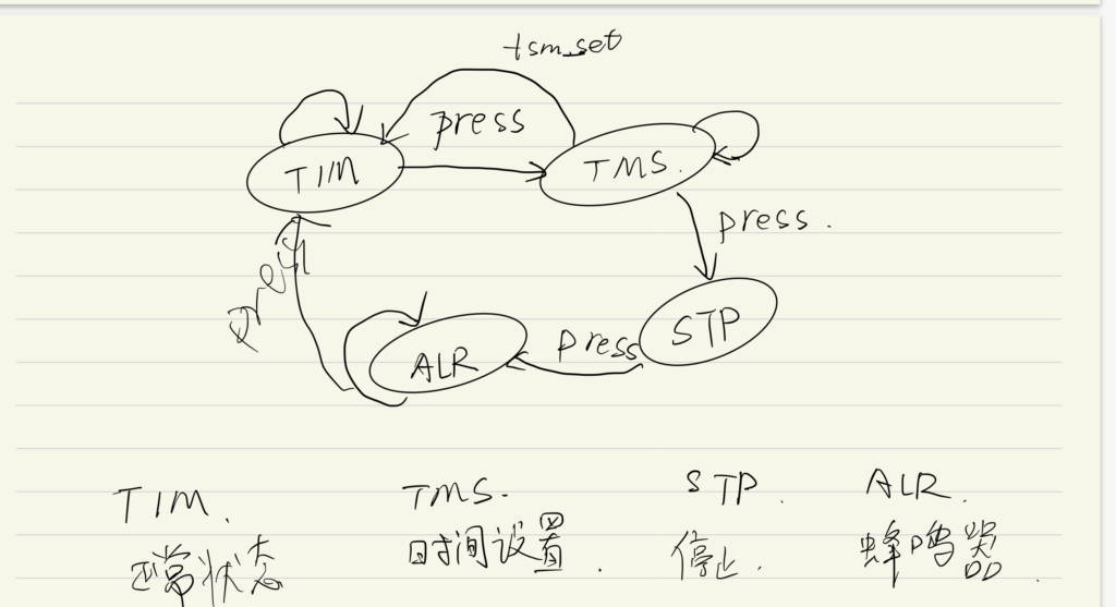 parameter TIM=2’d0, TMS=2’d1, STP=2’d2, ALR=2’d3; // i.e. TIMing, TiMe Setting, SToP watch, ALaRm (4 funtion)