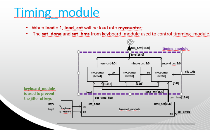 接收PLL多次分频得到的1Hz时钟信号作为模块的时钟信号,设置17位数据用来存储当前时间([5:0]表示秒,[11:6]表示分,[16:12]表示小时),当秒达到59时,则下一次操作为秒位置0,同时分位加1,分钟与小时的关系依次类推。同时当load信号使能时,即设置时间功能打开时,数据位数据将被加载进来的数据覆盖。